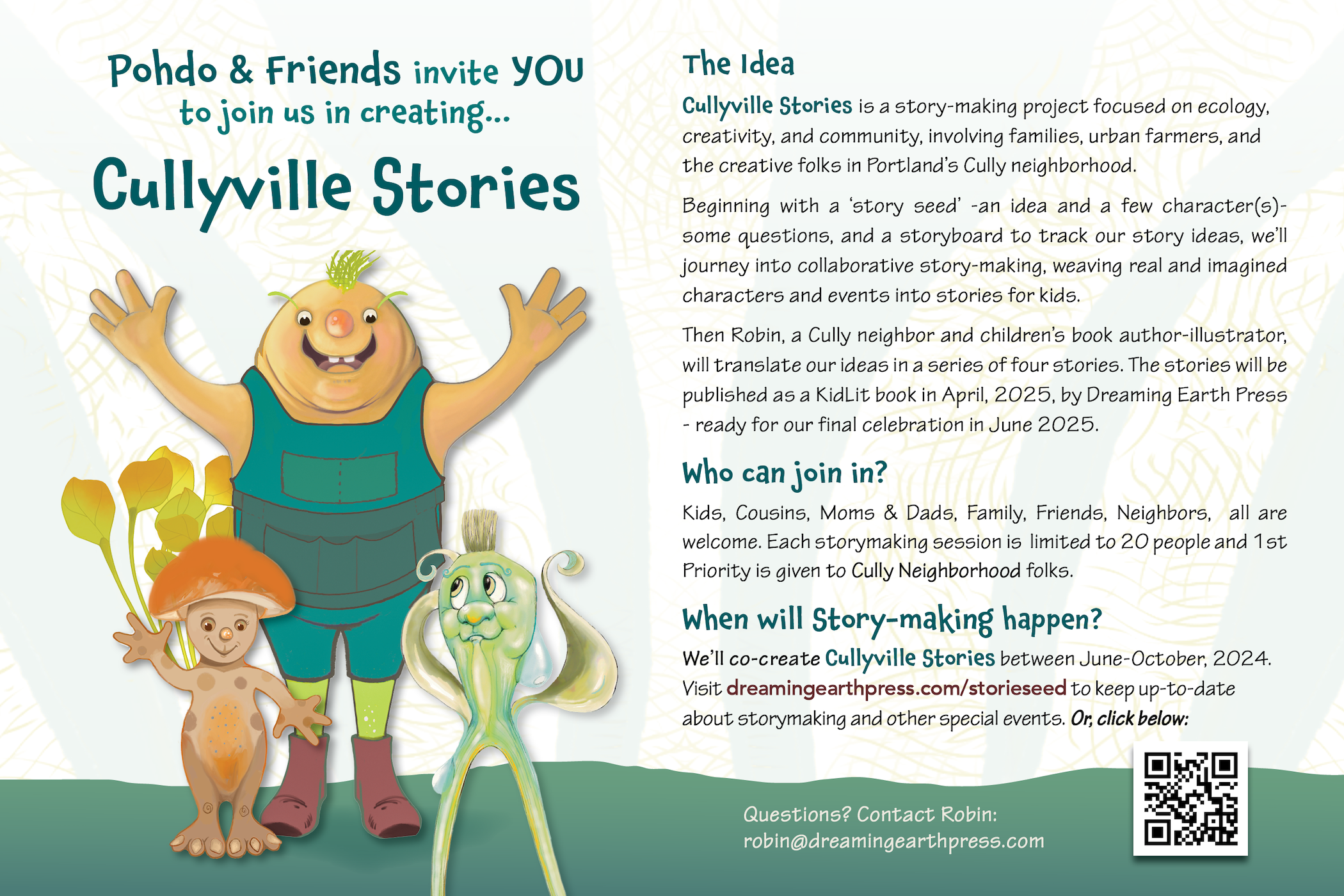 Cullyville Stories is a community story-making project based in the Cully Neighborhood of NE Portland, Oregon. The project has two parts: Story-making (for kids and families), and Podcast interviews with innovative folks who are contributing to our community’s benefit and sense-of-place. Want to know more? Here’s some info about part one – Story-making!
