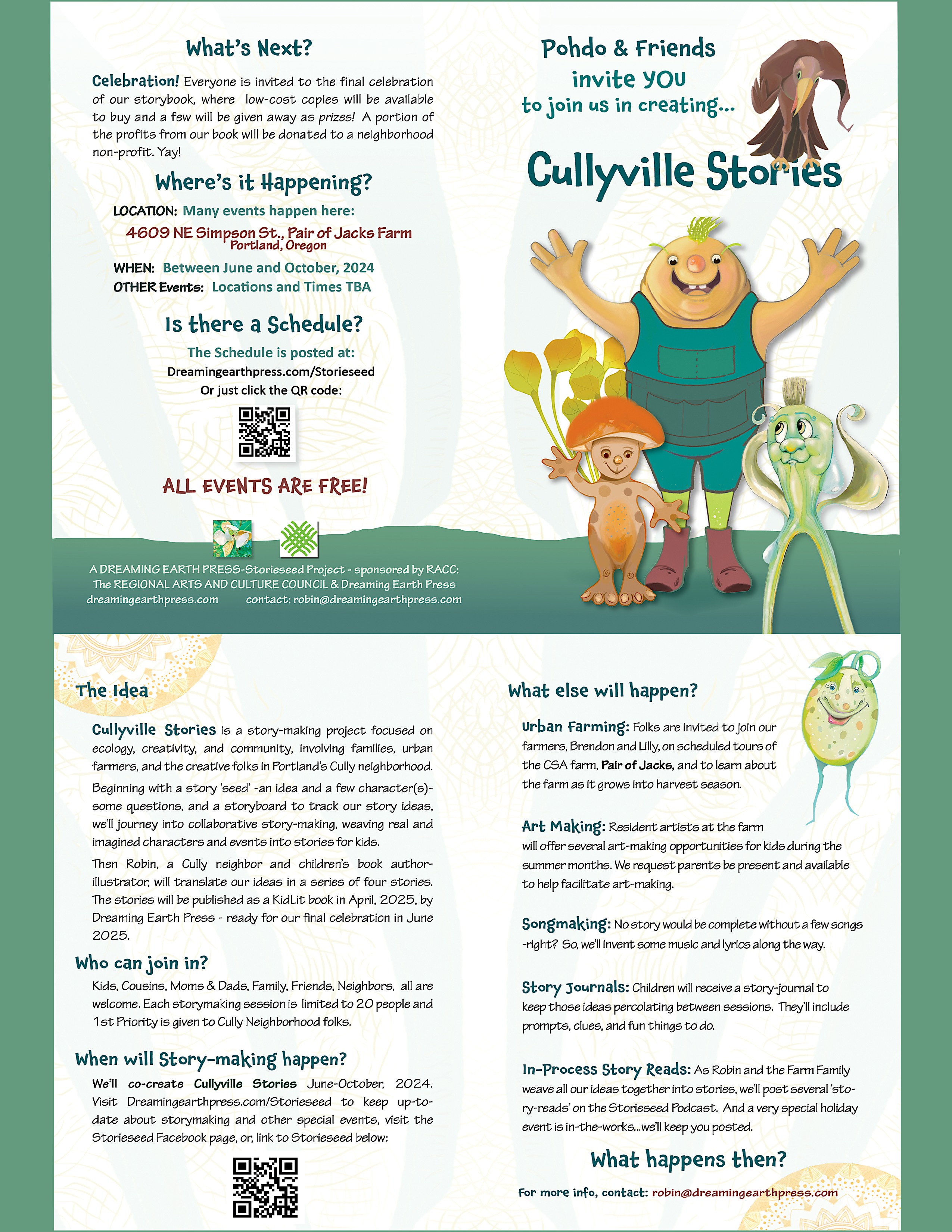Cullyville Stories is a community story-making project based in the Cully Neighborhood of NE Portland, Oregon. The project has two parts: Story-making (for kids and families), and Podcast interviews with innovative folks who are contributing to our community’s benefit and sense-of-place. Want to know more? Here’s some info about part one – Story-making!