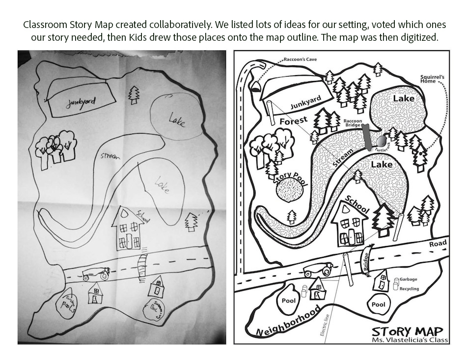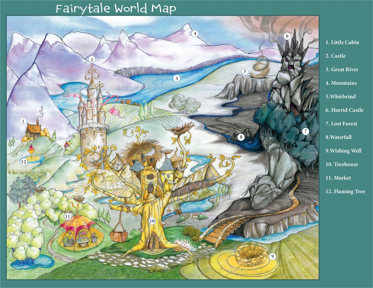 The Fairytale Map (in slide-show above) was not drawn in birds-eye view. It’s more like an illustration of a Fairytale World with a foreground – up close, where the treehouse is – and a background – in the distance, where the river and mountains are. For this project, four classrooms created one setting and, as you can see, there are many places for action to happen…maybe a few too many? Each classroom got to invent 3 setting details, then they used the whole map to create their individual stories.