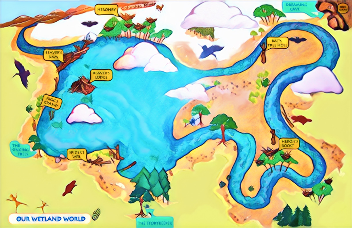 Also above is a map made of a real place – a wetland park close to the kids’ school called ‘Whitaker Ponds.’ While on a field trip, we learned about the animals that live there and explored their habitat. We saw blue herons, a beaver dam, wood ducks, dragonflies, and wild rabbits as we gathered story ideas. The map labeled ‘Our Wetland World’ was used in many classrooms during Earth Arts NW residencies by kids who were learning about habitat and animals, and creating stories about them.